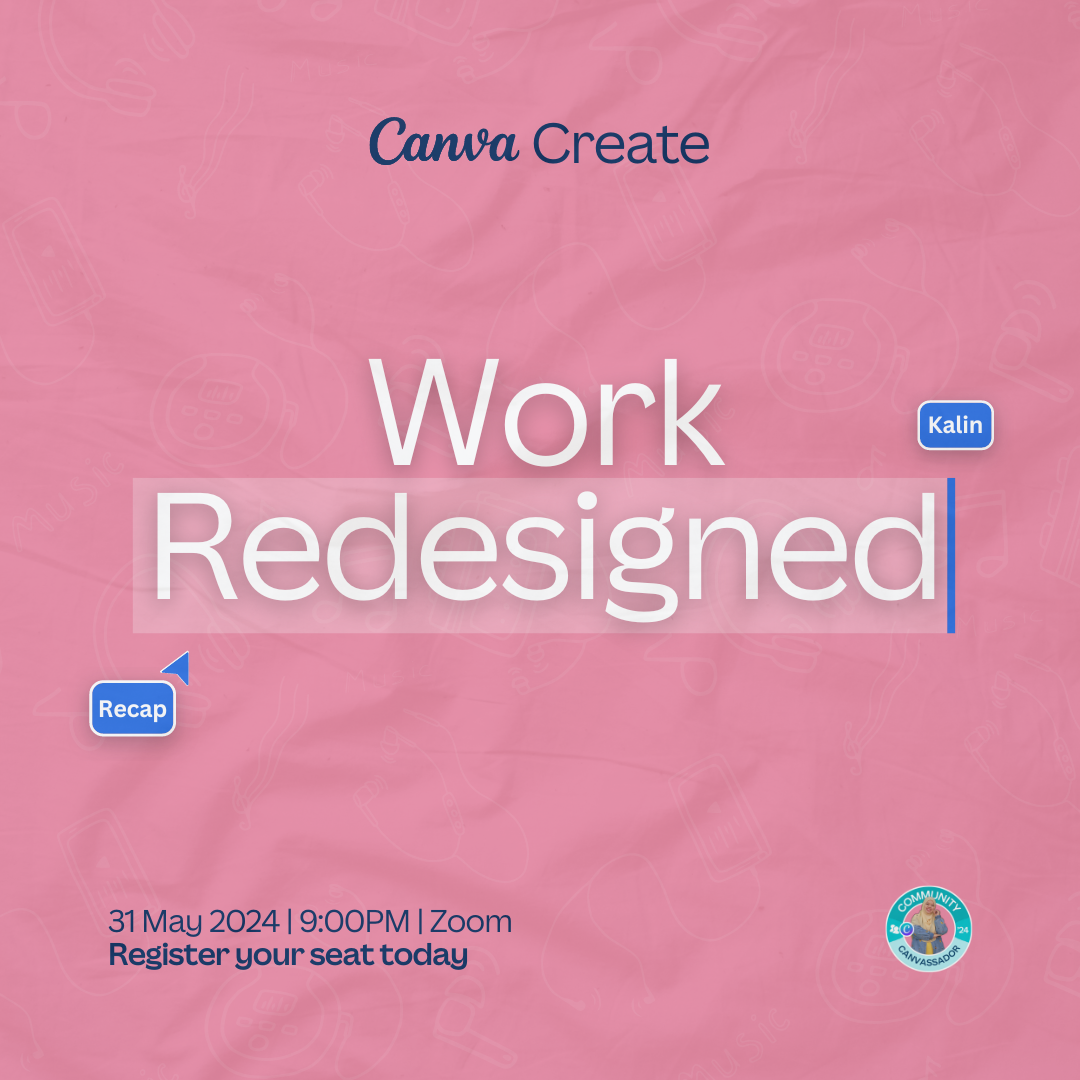 Anda terpilih untuk sertai sesi zoom tentang "Canva Create Recap : Work Redesigned." Dalam sesi Zoom ini, Anda akan belajar tentang features and tools baru dari Canva.